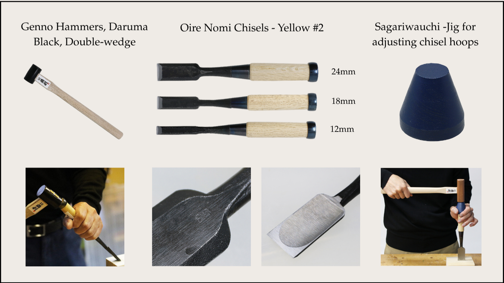 This starter set pairs a reliable Japanese hammer (*Genno*) with the three most popular Oire Nomi chisel sizes from our store. It’s designed to support your chiseling process—from initial setup to detailed carving. If you do not already own sharpening stones, we recommend adding those to your order.
