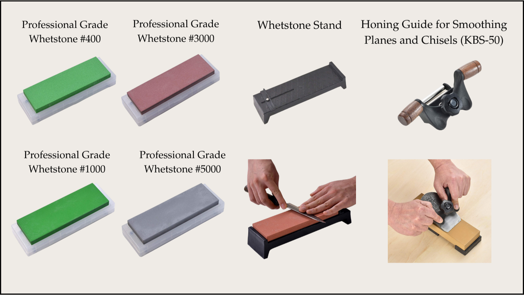 A professional-grade set featuring sharpening stones in grits #400, #1000, #3000, and #5000. It includes a sharpening guide for accurate results on planes and chisels, along with a stone base to ensure stability while you sharpen.