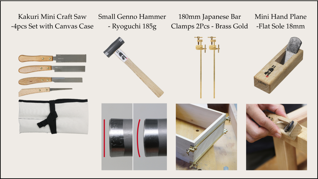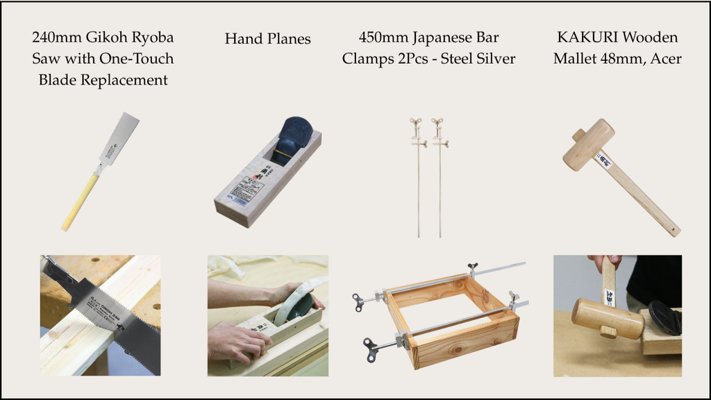 Selected specifically for joinery tasks like box making. With a saw, clamps, plane, and mallet, you can create strong, precise joints. This set supports a wide range of work, from cutting lumber to final finishing.