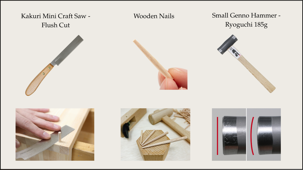 Master the art of using wooden nails with this specialized set. It features a flush-cutting saw for trimming wooden nails without damaging the surface and a hammer designed for precise striking. These tools significantly improve your efficiency.
